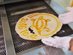ペーストを丸くし、専用の焼き器で伸ばして素焼き(?)し、そこに醤油やソースで絵を描く。そして、再び本焼きをすればできあがり。
