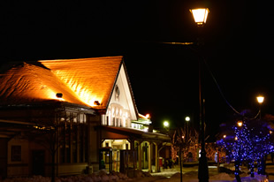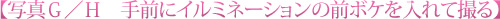 ライトアップされた建物だけを撮ると意外と寂しい感じがします(写真G)。そこで一工夫。もし、近くにイルミネーションがあるならば、それを手前側に入れてぼかしてみると、華やかな印象の写真に仕上がります(写真H)。