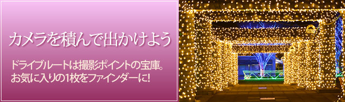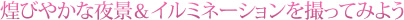 年末が近づくにつれ街はイルミネーションで彩られ、ドライブ先でもキラキラした風景に出合うことがあります。今回は、秋~冬にかけてシーズンを迎える夜景&イルミネーションの狙い方について紹介してみたいと思います。