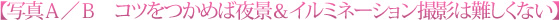 最近のカメラは手ブレ補正機能が優れていますが、シャッタースピードが極端に遅くなってしまう夜景&イルミネーション撮影では話が別。実際に、「夜景」モードに切り換えてそのまま撮った写真Cはぶれてしまいました。
