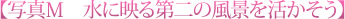 写真Mのほか、写真Bや写真Jも同様に水面を活かして撮影しています。必ずしも水辺とはいきませんが、もし近くに水面があるようならば、ぜひ作画に活かしましょう。