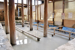 入浴者はまず、かけ湯をしてから、加水されて濃度も温度も入りやすいコロイド硫黄温泉につかって、体の汚れを落とす。