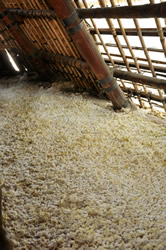 明礬地獄では、地表に噴出する高温の蒸気を、茅葺小屋の中に集めるように溝を掘り、上に重ねた小石や青色粘土を通過させて地表に導く。湯の花小屋内部を35度に保つと、数日後には床一面に絹糸上の結晶体が発生してくる。これが明礬温泉の湯の花だ。