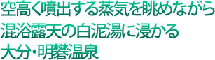 明礬(みょうばん)温泉は、別府温泉郷のなかでも最も地熱活動が活発な地域。明礬地獄と呼ばれる蒸気噴出孔付近では、江戸時代から続く昔ながらの製法で、湯の花採取が行なわれている。また、美肌効果の高い濃厚な泥湯の露天風呂も、この地域ならではの温泉の楽しみ方だ。