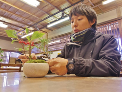 訪れた時は、中国からやって来たカップルが、12月の課題である「お正月飾りの彩花盆栽づくり」を体験していた。講師の言葉に従いながら、黒松とヤブコウジ、苔を鉢に植えていく。