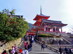 清水寺は「茶碗坂」「松原通」といった両側にお土産店が並ぶ坂の上にあります。目立ったのは「レンタル着物」の看板。日本人だけでなく、韓国や中国の観光客にも大人気のようで、着物に着替えて参拝に向かう人たちが目立ちました。