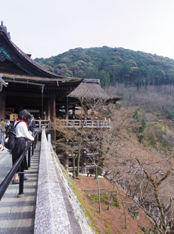 その奥が寛永10年(1633年)に再建された本堂です。舞台は本堂からやや傾斜して設置されています。舞台の高さは12m、4階建てのビルに相当します。木造ですから、頑丈な手すりはありません。