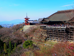 清水寺の舞台と三重塔、眼下に京都市街