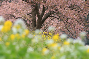 早咲きで有名なカワヅザクラが咲く川岸を撮影した写真です。