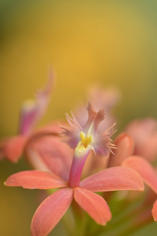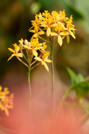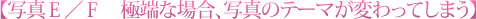 写真Eはオレンジ色の花のほうに、写真Fは黄色い花のほうに、同じ位置からピントの位置だけを変えて撮影しています。