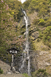 熊野から国道168号を走ると、二津野大橋の手前にある「十二滝」。水量は少ないが、落差は80mとも100mともあるといわれ、見ごたえがある