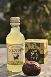 十津川名物の柚子で作った「ゆうべし」と熊野の「じゃばらサイダー」。ゆうべしは中をくり抜いた柚子に、そば粉、米粉、味噌、ごま、鰹節を混ぜ合わせたものを詰めて蒸し、寒風で乾燥させた保存食