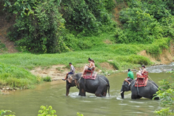 象乗り体験はこんな感じだった。象乗りの次は象と一緒の水浴びが待っていた。川の中で象の体をさすったり、象の背中に乗ったり、そして象に水を思いっきりかけられたり…。特別な時間が過ぎていった。