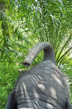 象は気ままだ。すでに歩く道程はわかっているのだろう。勝手に森の中の細道を進む。時には道草をくって樹木に巻き付いた蔦の葉を、鼻を伸ばして取って、口に運び出す。