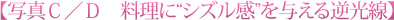 料理を撮る時によく言われるのが“シズル感”です。俗に「おいしそうと思ってしまう料理などの瑞々しさ」を意味する言葉として使われます。この“シズル感”を出すのに使うのが逆光線なのです。