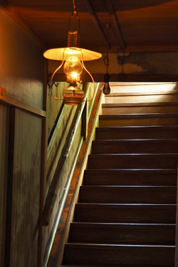 泊まる部屋は廊下を進み、階段を下りた先にあった。外はまだ明るいのだが、廊下と長い階段はやや暗い。足元を照らしてくれるのはランプだった。