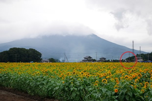 ヒマワリ畑に着いて、まず1枚撮ったのが写真Aです。今ひとつだな~と思い、よく見ると、右に展望台(写真Aの赤丸部分)らしきものが。