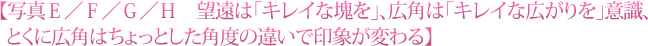 写真Gは上からのぞき込むように、写真Hは少し下から遠くを望むように撮っています。ここでは、花が散漫な印象になった写真Gよりも、花の大きさに強弱が生まれ、遠近が誇張された写真Hのほうが、よりキレイに感じます。広角で撮る場合は、ちょっとした角度の違いよって花の印象が変わるので、色々な方向から狙って見ることが大切です。