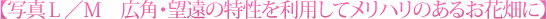 今回見てきたように、花がいっぱい咲くお花畑をよりキレイに見せるには、ズーム機能(焦点距離)をうまく利用して、広角で面的な広がりを作ったり(写真L)、望遠で花の密度感を出して上げること(写真M)がポイントになります。