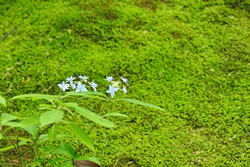 目を引くのは美しく生えそろったコケです。林の下を緑の絨毯(じゅうたん)が続きます。