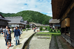 絵付けを終えてからは宿場を散策する。全長500mほどの往還の両側に茅葺きの大きな民家が並ぶ。水路も整備されており、今日では観光客のためのビールやラムネが冷やされている。