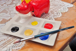 水性のアクリル絵の具は、白、黄色、赤、黒、金色、青の6色。これらをそのまま塗ってもいいし、混ぜたり水で薄めたりしてピンク色などを作ってもいい。要は自由だ。