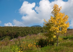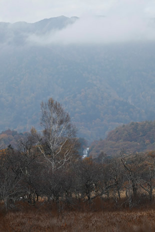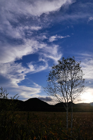 原野に生える木をポイントに狙ったのですが、曇りの日の白い空を背景にする気にはなれず、紅葉した山肌を背景にしました。しかし、白い雲が流れる青空をバックにしたほうが断然ドラマチックです。