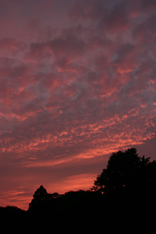 「高層雲(こうそううん)」は、上空2000~7000mにでき、空全体がグレーに見えているときの雲です。主に雨の降る直前に見られるのですが、天気が回復するときにも見られ、日に染まると真っ赤な朝焼け・夕焼となります。台風や寒冷前線が通過した後などに見ることができます。