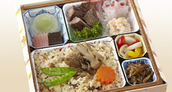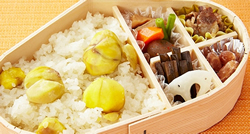 茨城県にこだわったお弁当です。笠間の栗を使ったおこわ、常陸牛の山椒煮、甘納豆などを使用しています。