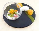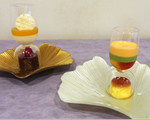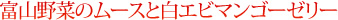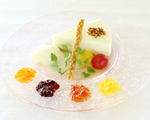 富山野菜がムースに。カボチャ、ニンジン、ホウレン草などがスイーツに生まれ変わりました。また、ヨーグルトに白エビ(白エビせんべい)マンゴーゼリーを添えたものも。2種類が味わえるスイーツです。まさに富山県名産をスイーツに取り入れて最優秀賞を受賞。見た目もおしゃれですね。