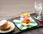 有磯海SAは上下線ともに受賞という快挙を成し遂げました。砂糖を使用しないで作った麦芽水飴や金時豆、寒天利用の羊羹などを使用。塩サイダーとともにいただきます。