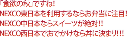 いろいろなものがおいしく食べられる季節になりました。SA&PAにも新メニューがたくさん並びました。そこで、それぞれのSA&PAの企画に乗ってしまいましょう! NEXCO東日本エリアではお弁当を買って、中日本でおやつを食べて、西日本は夕食の丼なんてできたら幸せですよ!