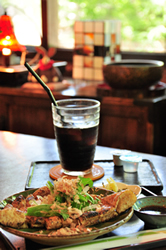 不動堂裏の展望台脇には、不動茶屋という大正モダンを感じさせるしゃれた休憩所があった。ここでは名物の三角油揚げを食しておこう。豆の味を感じる、うま味の高い油揚げ。帰りがけに、近くの豆腐屋でも購入できる。