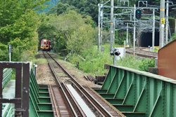 やがて、トロッコ嵯峨駅を出発し、トロッコ嵐山駅、トロッコ保津峡駅を通ったトロッコ列車がトロッコ亀岡駅に姿を現した。客車を先頭に、ディーゼル機関車が後ろから押しての入線だ。