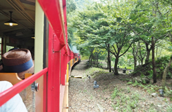 首都圏から行きやすいトロッコ列車。SL型のクリーンエンジンで動く機関車を先頭に、ガラスのない展望車と窓付き車両を連結。「上総牛久駅」から「養老溪谷駅」間を約1時間かけて走る。クルマおでかけ派にうれしいのは、上総牛久、里見、養老渓谷駅に駐車場があることだ。