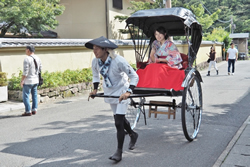 嵐山は数多くの人力車が走り、レンタル着物に着替えた女性たちが散策しており、華やかな雰囲気だ。
