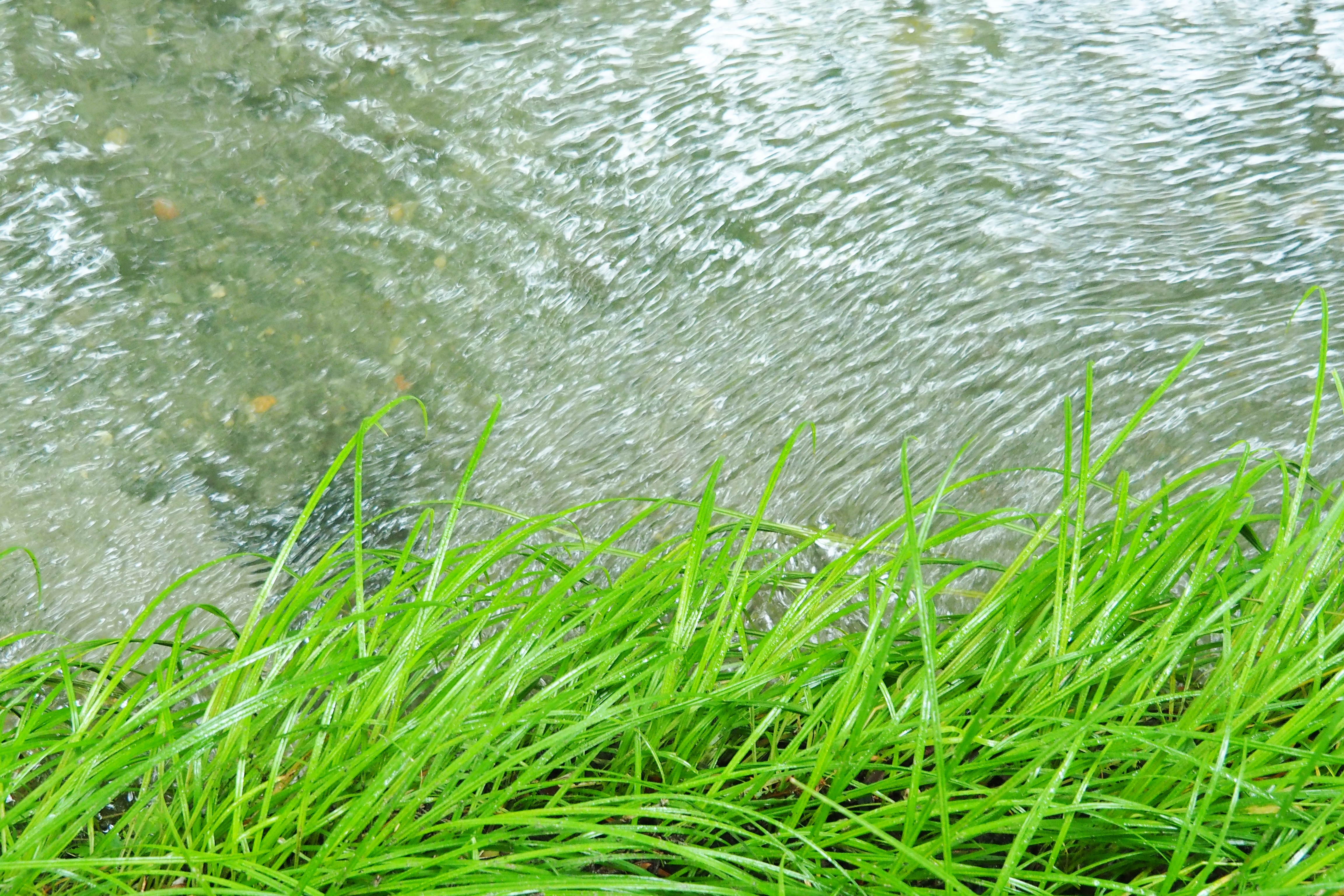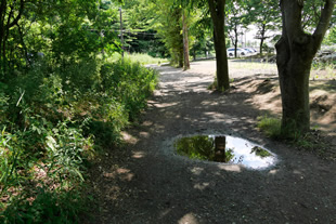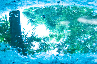 写真Jのような森の中の小径に水たまりがありました。近づいてみると周囲の木々が映り込んでいたので、これは面白いとWB設定や露出補正を変えながら、絵を描く気分で水の中に写る森の様子を捉えてみました(写真K)。ここではWB設定は「電球」、露出補正は+3ほどしています。