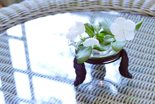 窓辺のテーブルに置かれたお花。写真Eのような場面で、テーブルに写った窓の明かりと花がキレイだったので、その部分をアップにしてみました。自分が気になった部分だけをピックアップするのが「イメージフォト」の撮り方のコツです。