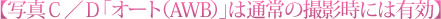 通常の撮影時にさまざまな光源下で、標準的な色合いにカメラが自動で補正してくれるのが「オート(「AWB」とも表記)」です。