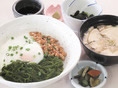 めかぶ、長イモ、納豆のネバネバ食材を温かいご飯にかけた丼。まさにウインタースポーツの前に最高の食材です。ねばりついでに、コブ斜面でもコブに飛ばされずに、ねばり強い滑りができるかもしれませんね(笑)。
