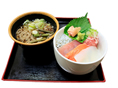 以前にも書きましたが、ここのスナックコーナーは築地直送がセールスポイント。築地の魚介類と信州ならではのそばのセットはいかが? おそばだけでは腹持ちが心配ですが、ミニ丼が付いているのでスタミナは十分です。