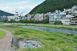 下呂大橋から北部を望む。川沿いには宿泊施設が並び、河原には噴泉池が見える