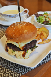 飛騨牛を使ったグルメも。写真は水明館「バーデンバーデン」のプレミアムバーガーセット(1500円)