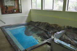 湯船の中には大きな岩があり、そこに切り込みが入っている。その昔、木製の湯船を設置するのに使った切り込みで、殿様が大岩を背に入ったのだろう。