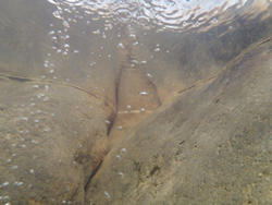 なぜ、そこに木枠を設置したのか。それは、その部分の大岩の割れ目から湯が湧いているからだ。その湯は現在でも湧き続けている。ややぬるい湯が湧き、加えて湯船横からは別の熱めの源泉が注がれて適温になる。