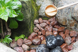 水琴窟とは日本庭園に設置される鉢と水を利用した音響装置です。小さな穴を開けたカメを逆さに埋め込みます。その上から水を流すと、流れた水滴がカメの中で反響し、琴のような涼しげで、美しい音色を奏でます。