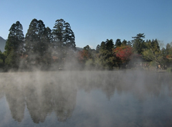 神秘的な金鱗湖。畔にはおしゃれなカフェもある。湖底からは温泉と清水が湧くために、天候によって湖面が湯気で揺れる