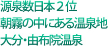 由布岳をバックに、朝霧に覆われた盆地の幻想的な風景。個性的な旅館。ランチ付きなどが好評な日帰り入浴プラン。風情ある風景と軒を連ねるおみやげ店。ノーマン・ロックウェル湯布院美術館、由布院美術館、由布院ステンドグラス美術館、マルクシャガールゆふいん金鱗湖美術館などが点在する散歩道。公共温泉が湖畔にある神秘的な金鱗湖…。
