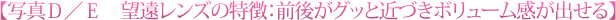 望遠レンズの特徴の一つとして、写真Eのように前後の距離感を縮め、ボリュームのあるように見せられることがあります。これを俗に「圧縮効果」と呼びます。