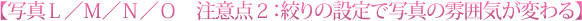 写真L/写真Mは背景にした花のボケ具合をそれぞれ絞りF2.8とF22で撮影しています。写真N/写真Оは前後のボケる範囲をそれぞれF5とF16で比較した写真です。